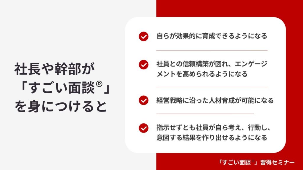 そのうえで、「すごい面談」が果たす役割として語られたのは、社員との信頼関係の再構築。