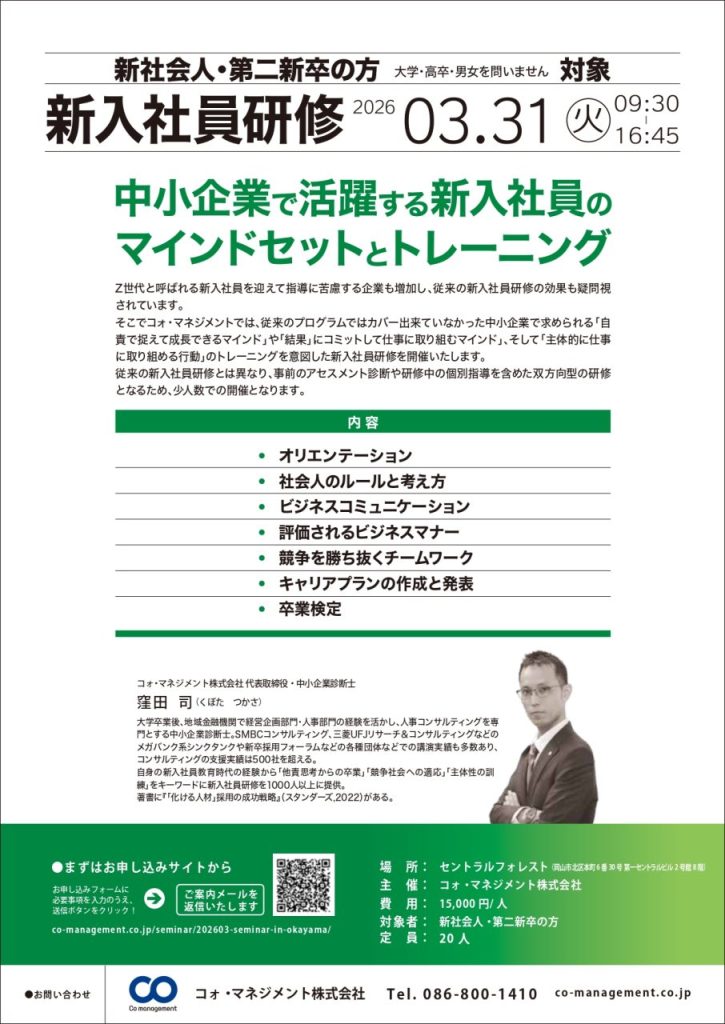 そこでコォ・マネジメントでは、従来のプログラムではカバー出来ていなかった中小企業で求められる「自責で捉えて成長できるマインドや、結果にコミットして仕事に取り組むマインド」、そして「主体的に仕事に取り組める行動」のトレーニングを意図した新入社員研修を開催いたします。