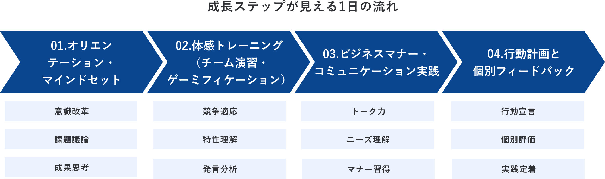 ゴールは「新入社員が現場で求められる力を理解し、行動を変えること」です。単なるビジネスマナーにとどまらず、「自責思考」「結果思考」といったマインドを身につけ、入社直後の不安定な時期を乗り越えられる人材へと育成します。